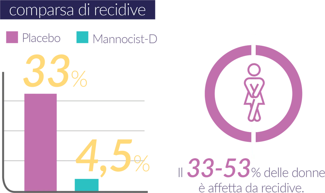 Lo studio clinico condotto su 43 pazienti, dimostra che Mannocist-D riduce significativamente la percentuale di cistite recidiva (4,5% vs 33% del placebo) ed attenua rapidamente: